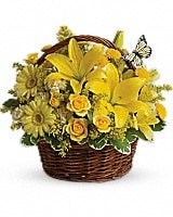 Wishes do come true, by the basketful, actually. This delightful arrangement is so full of sunny blossoms, it even includes two pretty yellow butterflies who obviously feel right at home, basking in the warmth.